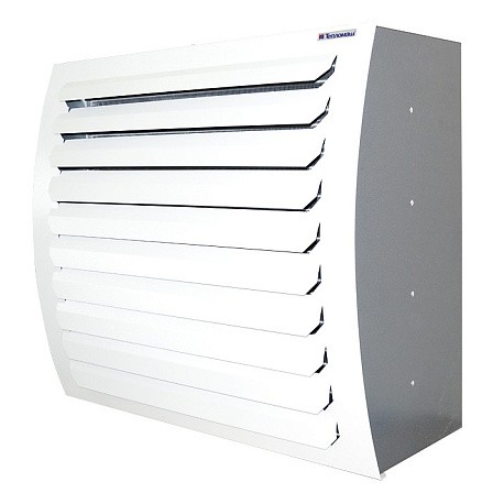Тепловентиляторы серии TW с водяным источником тепла имеют высокоэффективный воздухонагреватель из медных труб с алюминиевыми пластинчатыми ребрами. Воздухонагреватель позволяет пропускать воду с температурой до 150°С и давлением до 1,2 МПа. Специальная защитно-декоративная решетка на выходном окне тепловентилятора направляет поток нагретого воздуха вниз под углом 45°.